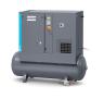 Schraubenkompressor Vollautomatische, intern komplett verrohrte und verdrahtete Kompaktanlage, einstufig, öleingespritzt verdichtend, luftgekühlt, schallgedämpft. Kältetrockner eingebaut, auf einem liegenden innenbeschichteten AD2000 Behälter aufgebaut.