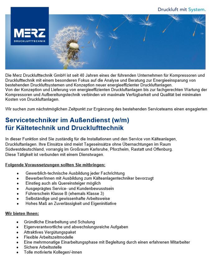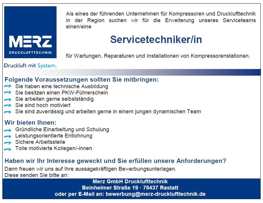 Bitte schicken Sie Ihre Bewerbungsunterlagen an: bewerbung@merz-drucklufttechnik.de
